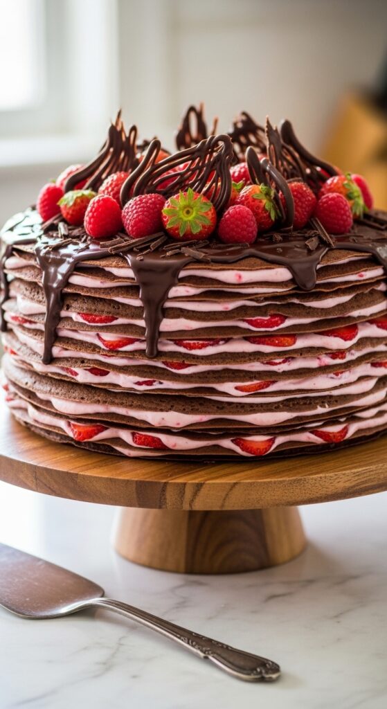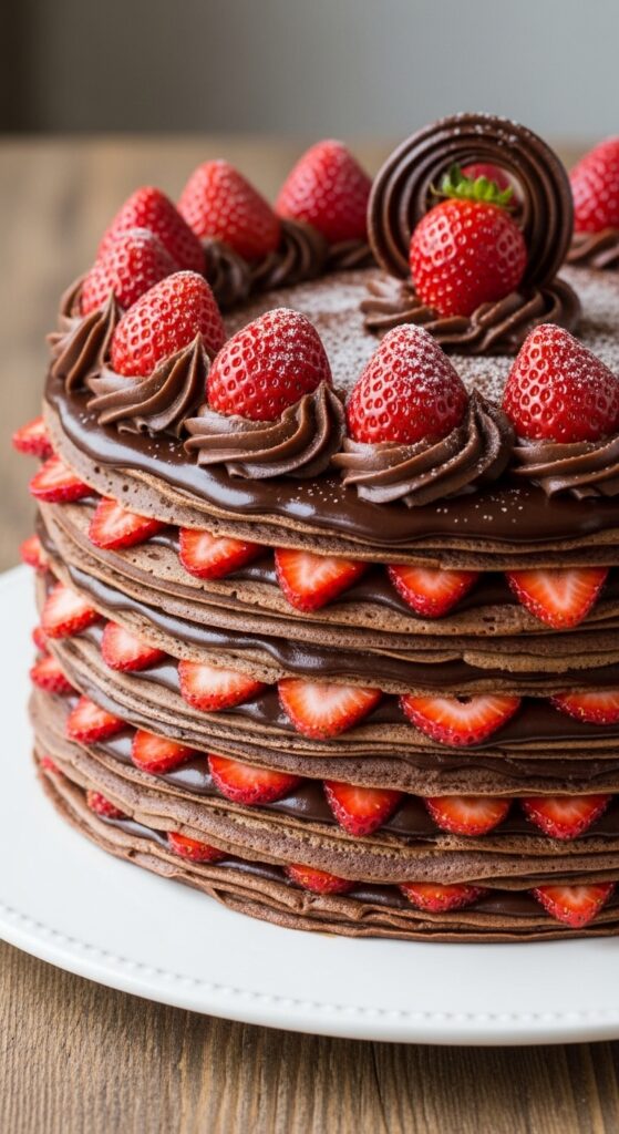 Chocolate Strawberry Crepe Cake is the perfect blend of elegance, flavor, and creativity. With delicate crepes, rich chocolate cream, and fresh strawberries, it offers a dessert experience that is both light and indulgent. 🍫🍓✨