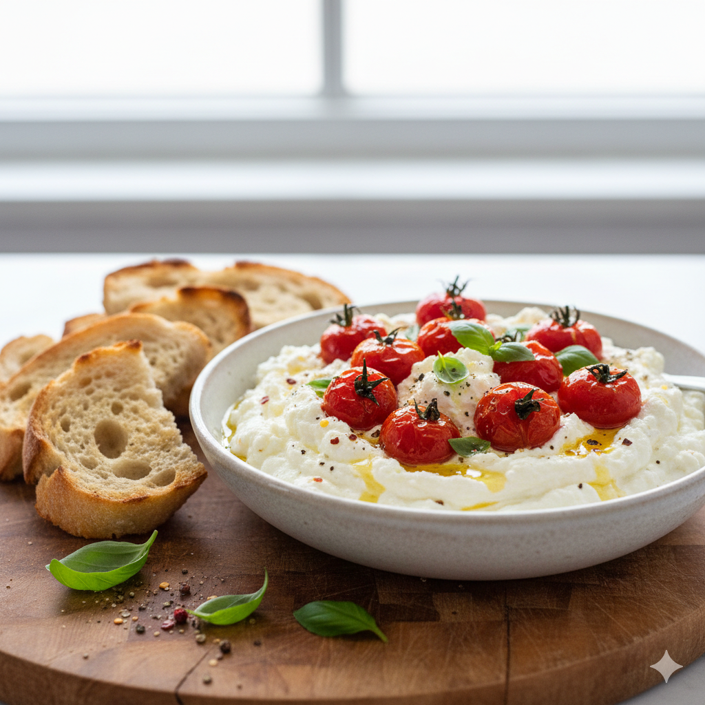 The origin of this dish lies in the sun-drenched hills of Southern Italy, where surplus summer tomatoes were slow-roasted to preserve their sweetness. By pairing the cold, citrus-infused ricotta with tomatoes that have been roasted until their skins blister and their juices turn into a syrupy “jam,” you create a sensory contrast of temperatures and textures. It is a “FlavorNote” masterpiece: the cooling dairy meets the acidic, hot fruit, unified by a generous drizzle of extra virgin olive oil and fresh herbs.