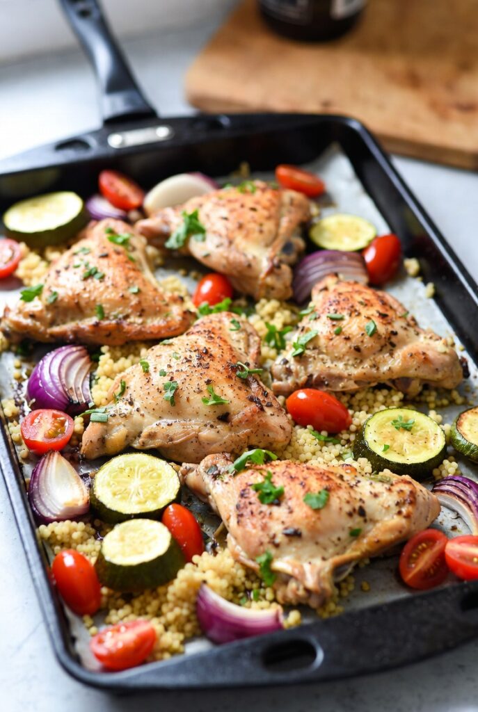 Historically, Mediterranean cooking has always prioritized the “one-vessel” philosophy—think of the Moroccan Tagine or the Spanish Paella. This recipe modernizes that tradition using the humble sheet pan. By roasting bone-in, skin-on thighs atop a bed of briny olives, artichokes, and cherry tomatoes, we create a self-basting environment. As the chicken fat renders, it mingles with lemon juice to create a “liquid gold” sauce that naturally confits the vegetables.