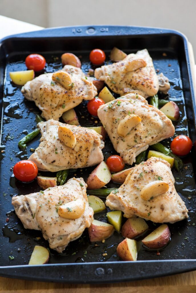 • The Garlic Trick: Leave 3-4 cloves of garlic in their skins and roast them whole on the pan. Once done, squeeze the sweet, roasted garlic paste directly onto your chicken.