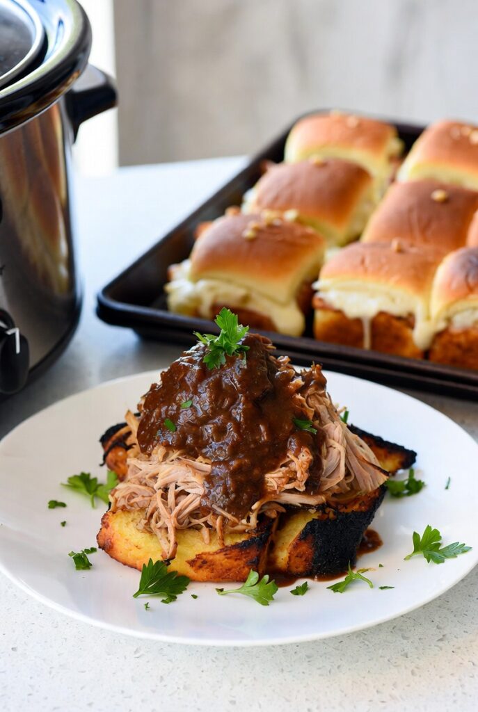 The secret to a “Master Draft” finish is the “Post-Cook Reduction.” The liquid left in the pot after 8 hours is a “High-Resolution” pork stock infused with soda spices. By taking a portion of this liquid and simmering it into a syrup (or mixing it with a high-acid BBQ sauce), you create a “Molecular Glaze” that coats the pork fibers. This ensures that the sliders are not “Soggy,” but rather “Glistening”—encapsulated in a concentrated lacquer of the very liquid that tenderized them.