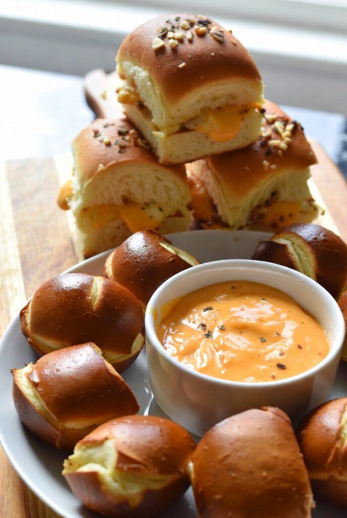 While the pretzels bake, simmer the beer and cream in a saucepan. Whisk in the cheddar, cream cheese, and spices until “Glossy and Homogenous.” Serve immediately.